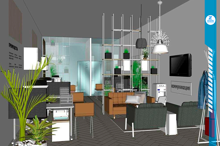 Совместно с дизайнерами разработан яркий и современный дизайн-проект офисного помещения, включающий 3D-визуализацию интерьеров, подбор мебели, освещения и декоративных элементов.